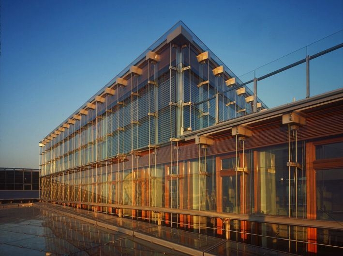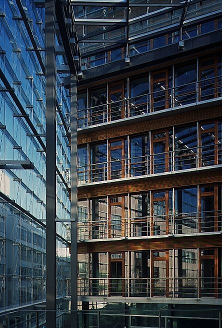 Eine Herausforderung war der Auftrag auch für Armin Strickner, der als Freiberufler für die ausführende Tischlerei das Projekt koordiniert und für die Fertigung optimiert hat. Für das siebenstöckigen Büro- und Geschäftshauses mussten nicht weniger als 40.000 maßgefertigte Holzeinzelteile terminlich und logistisch punktgenau Zeitgleich mit den entsprechenden Isolierglasscheiben an Ort und Stelle sein. Ebenso Neues Denken war also gefragt.